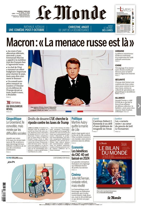 Di tutt’altro tenore il discorso del presidente francese, che si è concentrato su minacce reali e non presunte, e che è stato accolto con consenso bipartisan dai partiti e dalla stampa. Macron ha rimarcato come gli Stati Uniti, pur rimanendo alleati, abbiano cambiato posizione sulla guerra in Ucraina, per poi aggiungere che la Francia è entrata in una “nuova era” per l’incertezza sulla sicurezza europea. Notando che la guerra in Ucraina riguarda tutta l’Europa e che la Russia ha già reso il conflitto mondiale, aumentando costantemente le spese militari e le minacce ai vicini, Macron ha aggiunto: